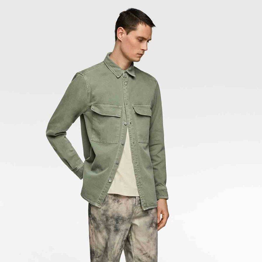 Relaxed fit overshirt with lapel collar and long cuffed sleeves. Washed effect. Front patch pockets with flaps. Side vents at hem. Front metal button closure.